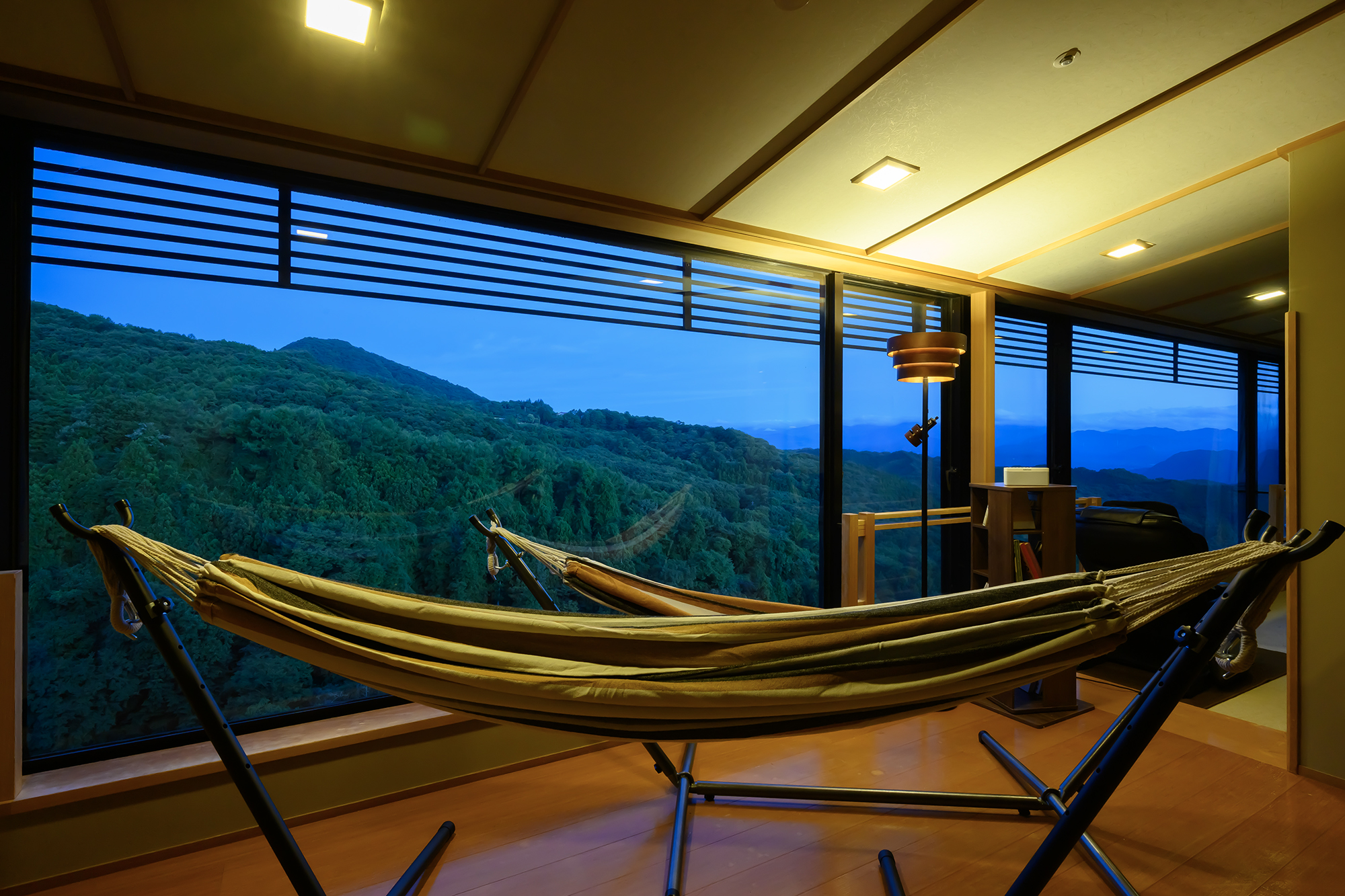石段街最上段に位置する当宿の石段街側入り口に最も近い千樹館。ご散策にも便利、山側の高層階からは遠く山並みを見晴らす絶景が広がります。離れの「ことほぎ」は全室ゆったりとした洋室フロア。気軽に伊香保旅をお楽しみ頂けるスタンダードフロアです。